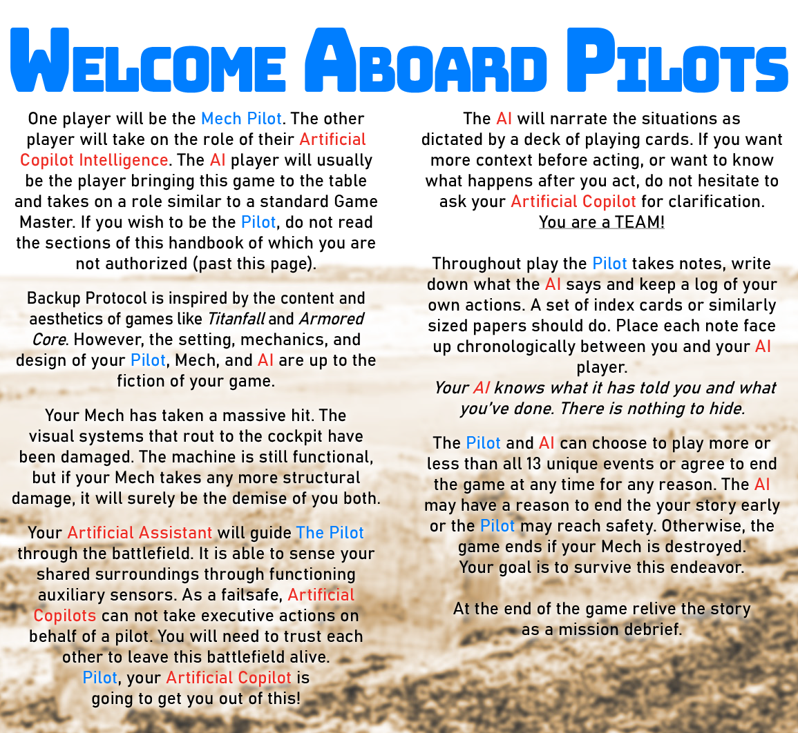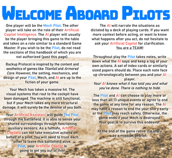 | Tags | journaling, mecha, Mechs, Narrative, No AI, Robots, Sci-fi, Tabletop, Tabletop role-playing game, Two Player |